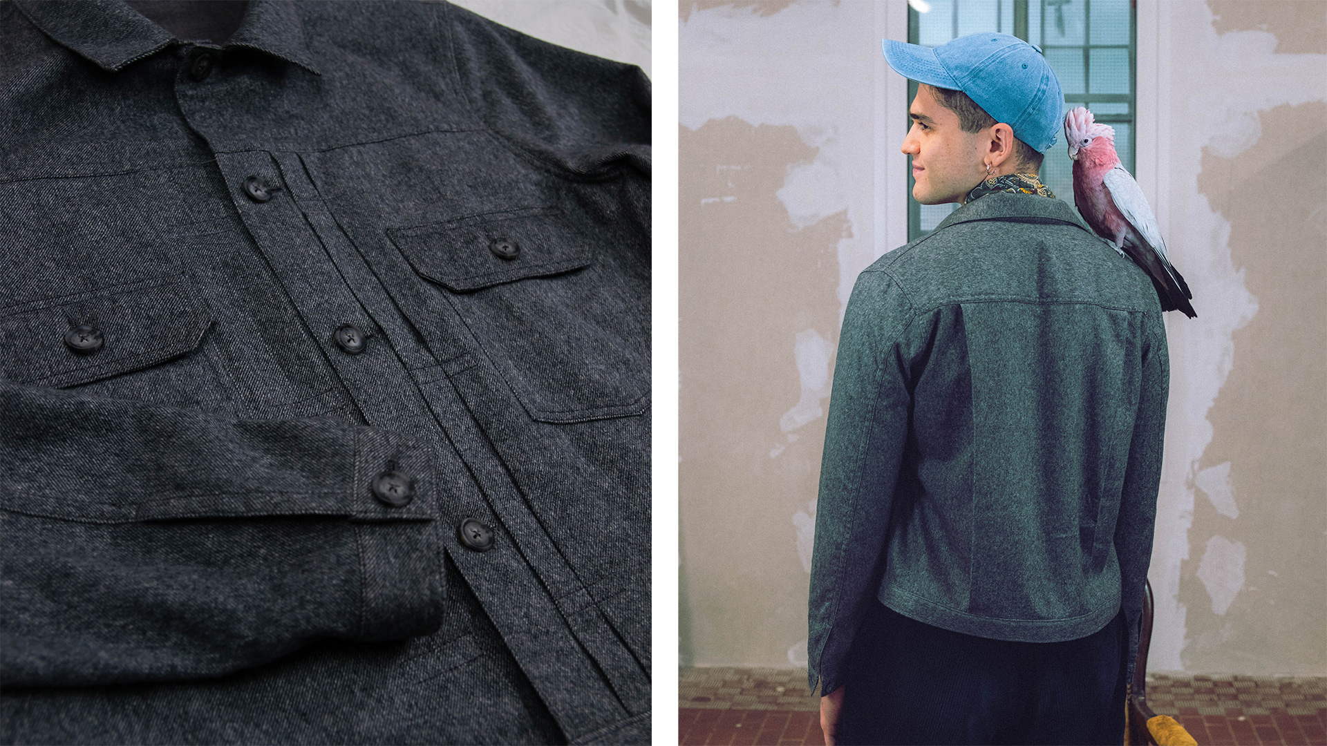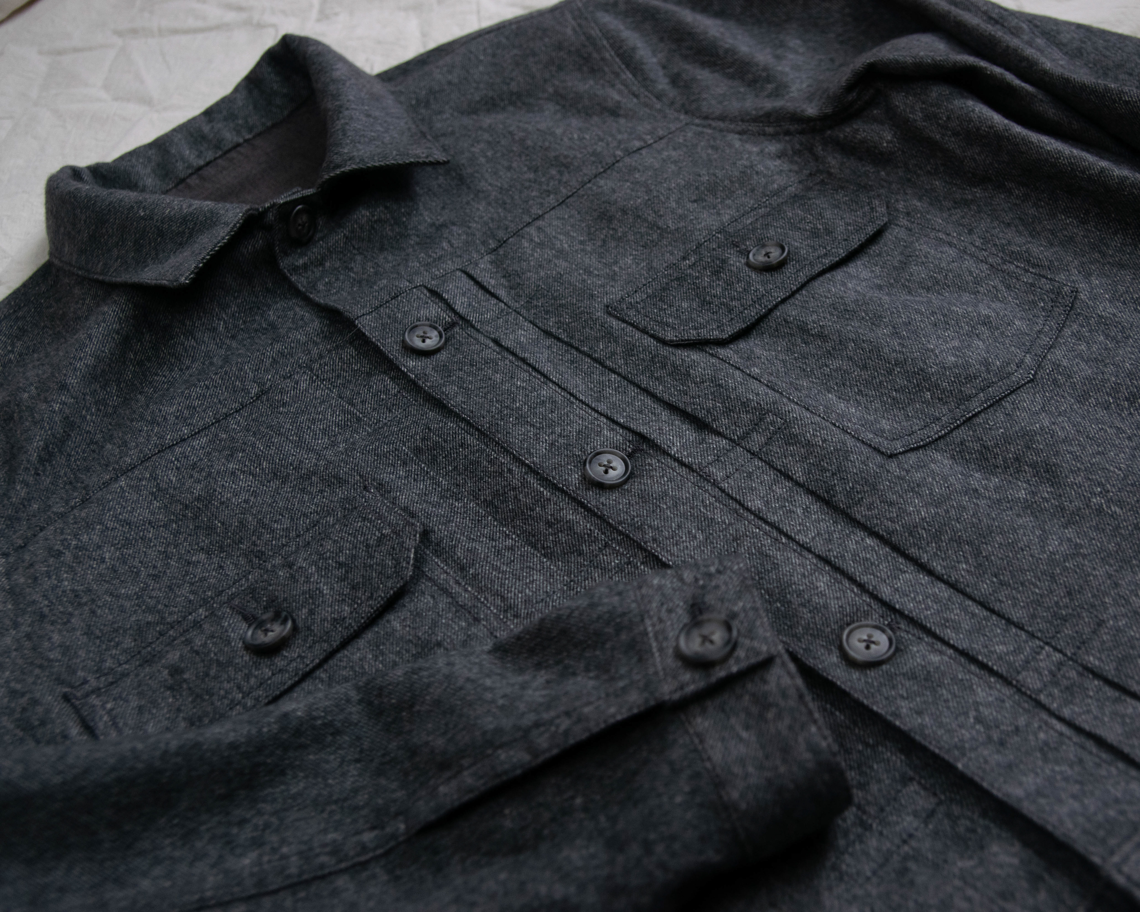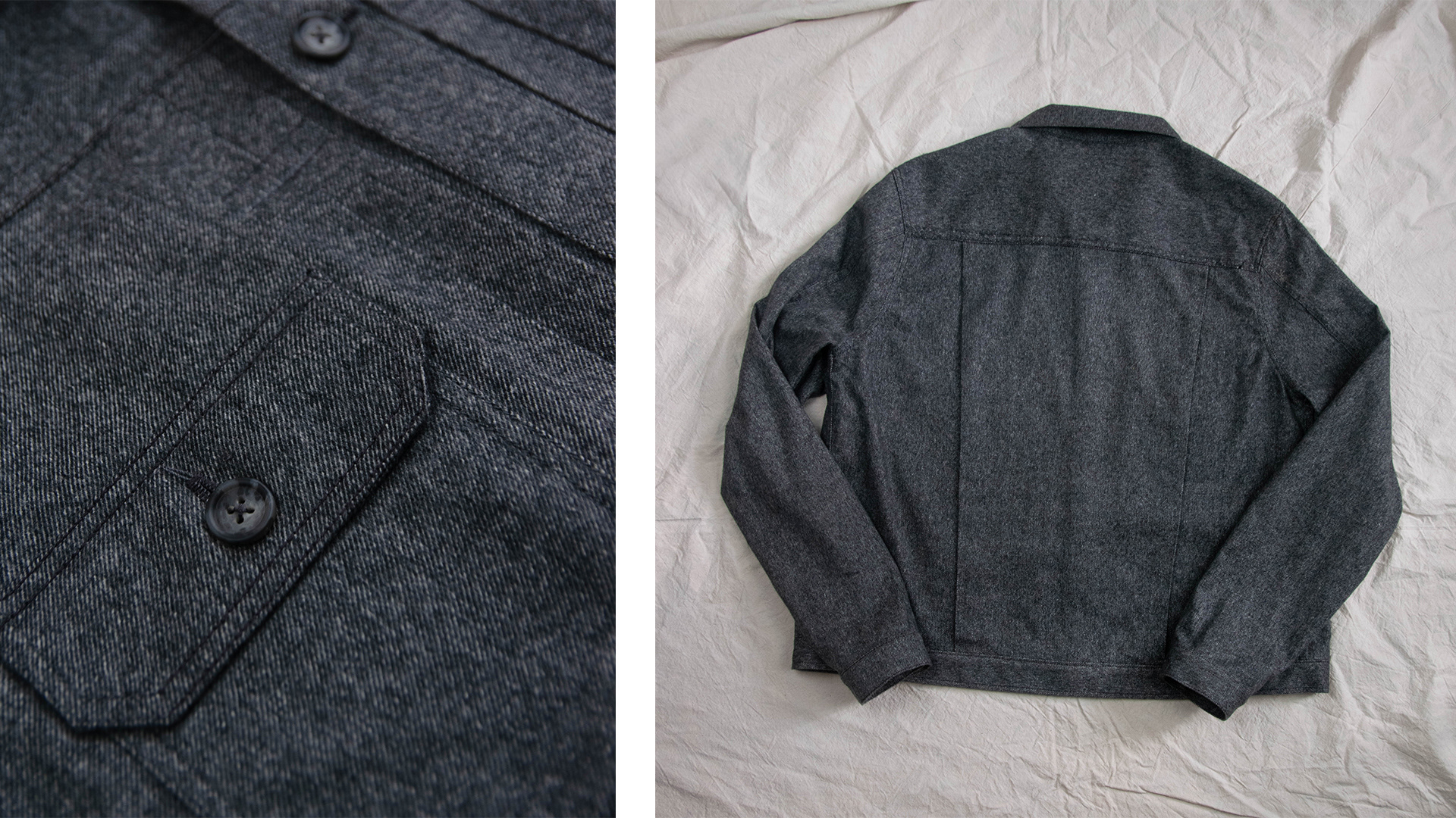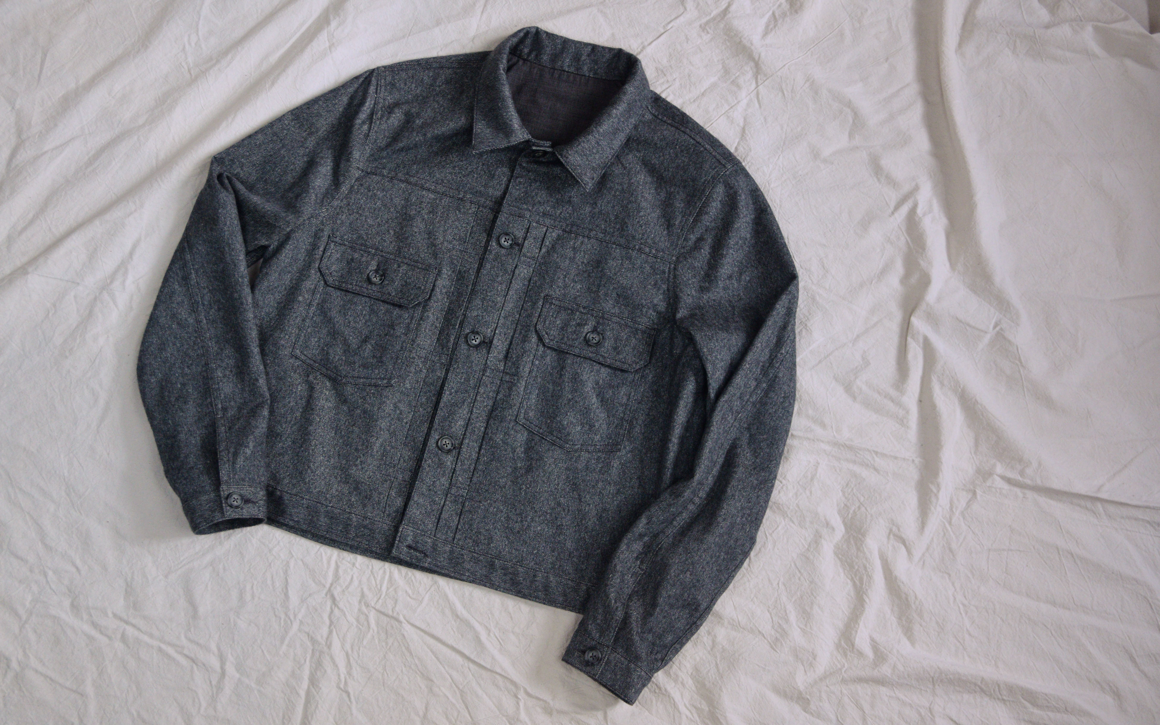 The prototype is made from a locally sourced brushed twill in 100% wool melange. Other ideal fabrics for it include non-stretch denim, cotton canvas, linen canvas. The (Type II) jacket is made-to-order and is available in sizes XS-XXL.