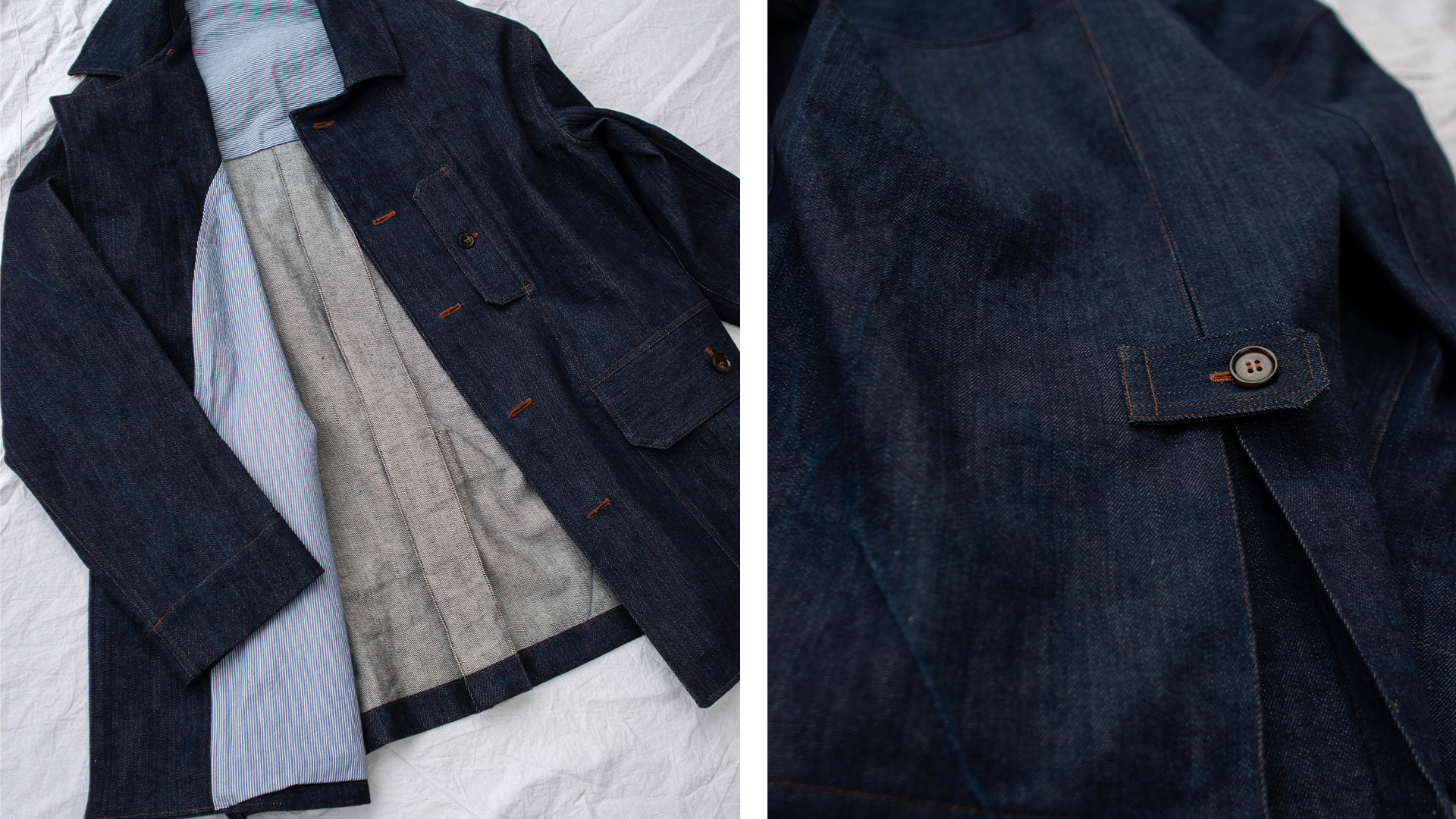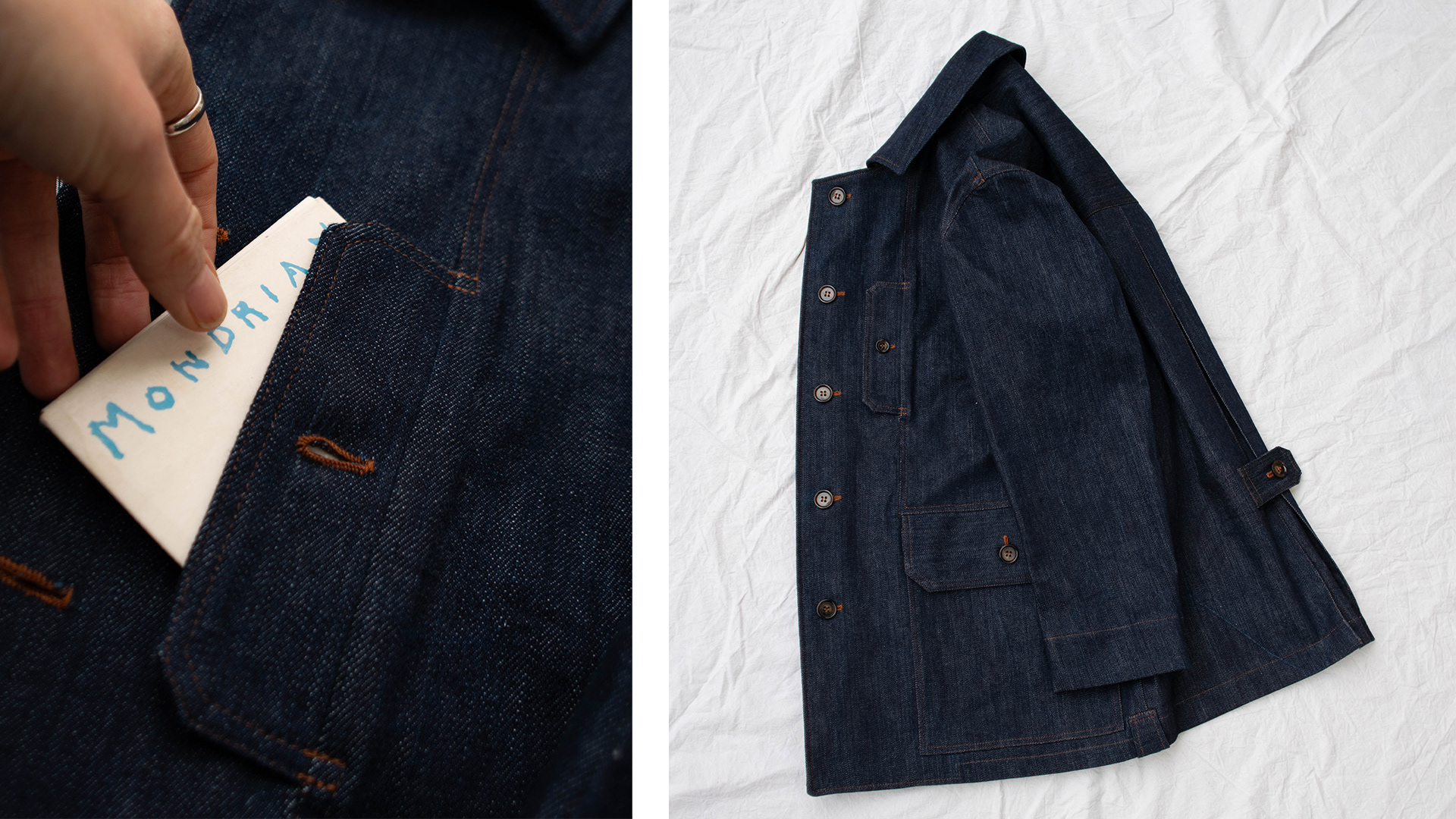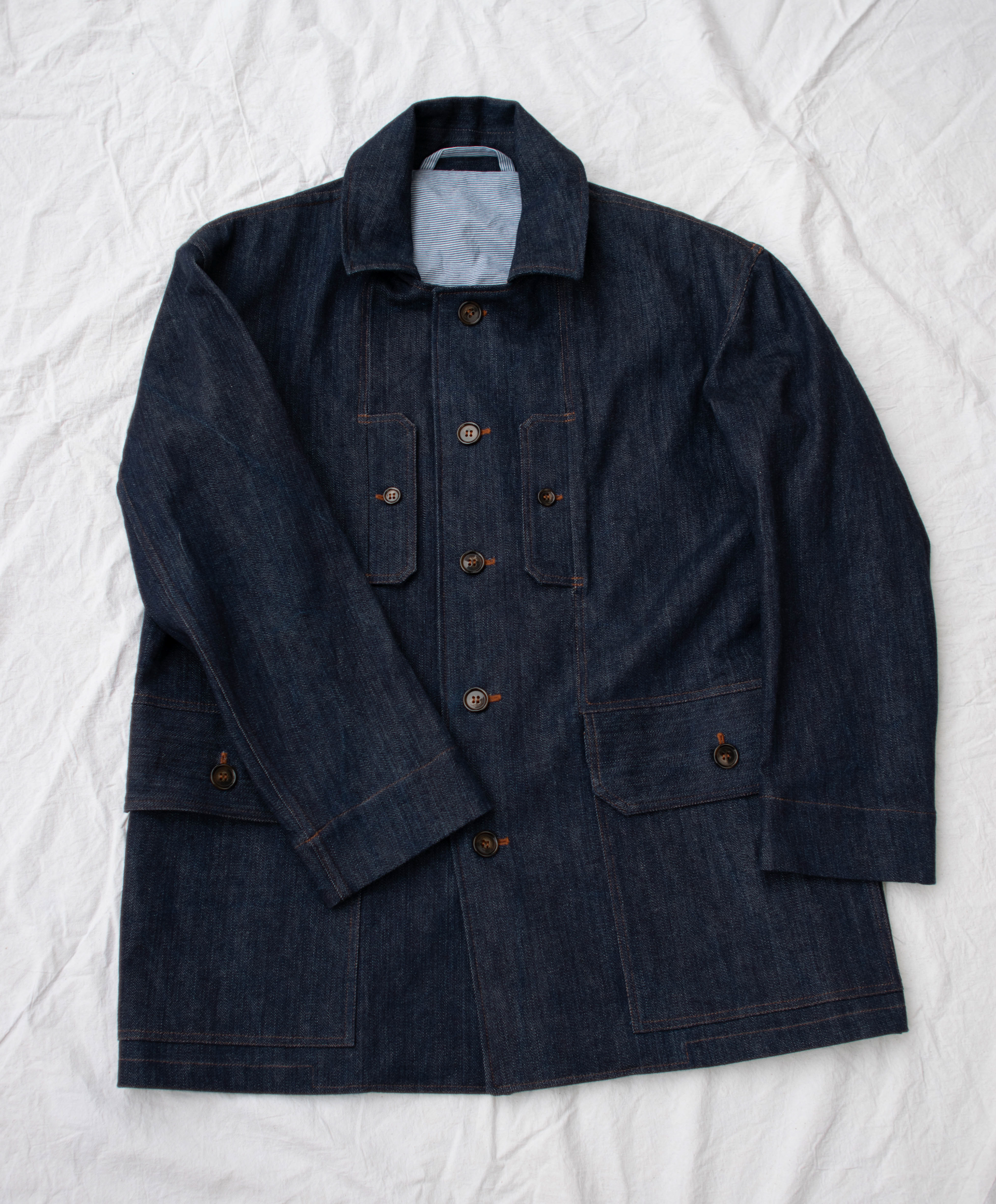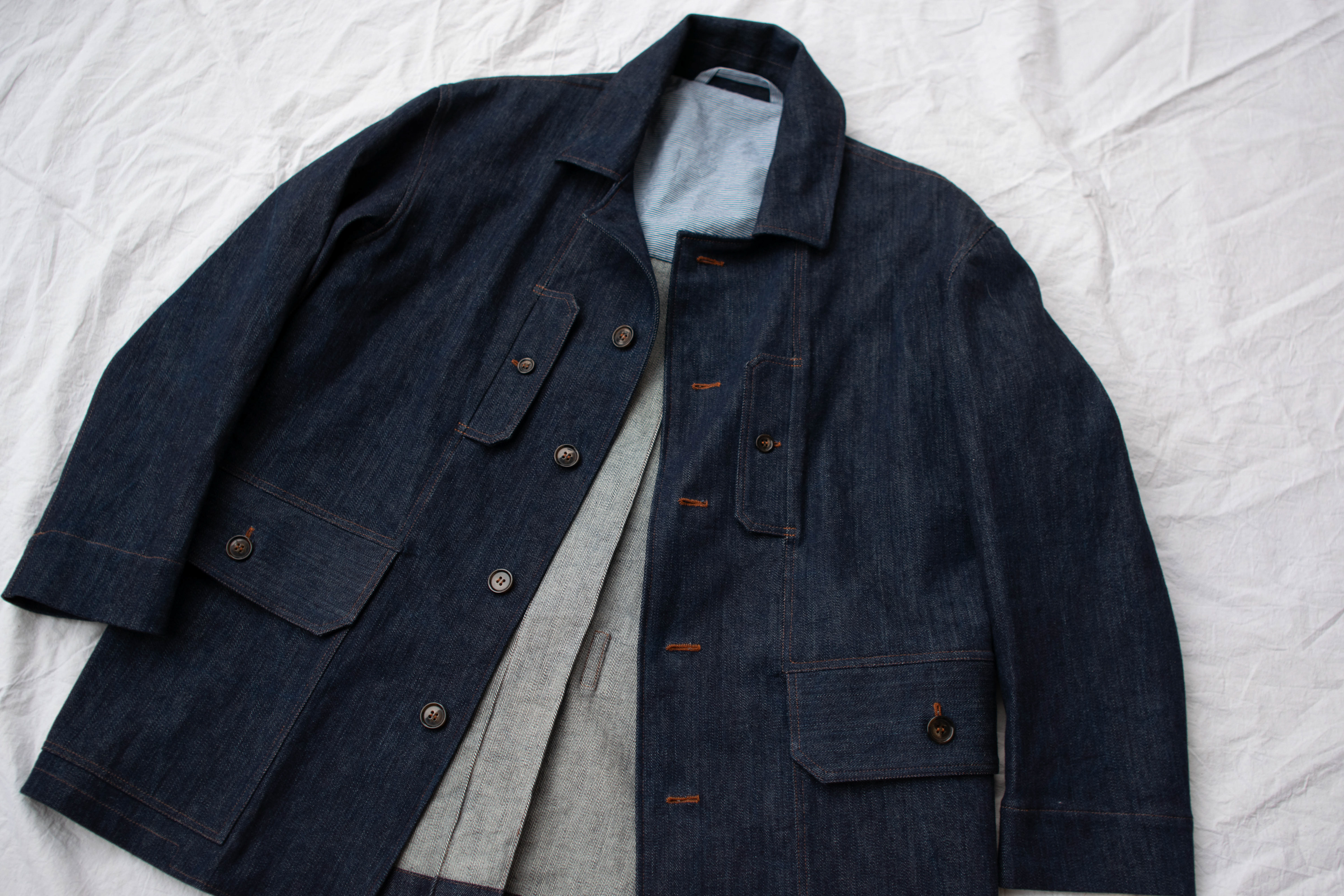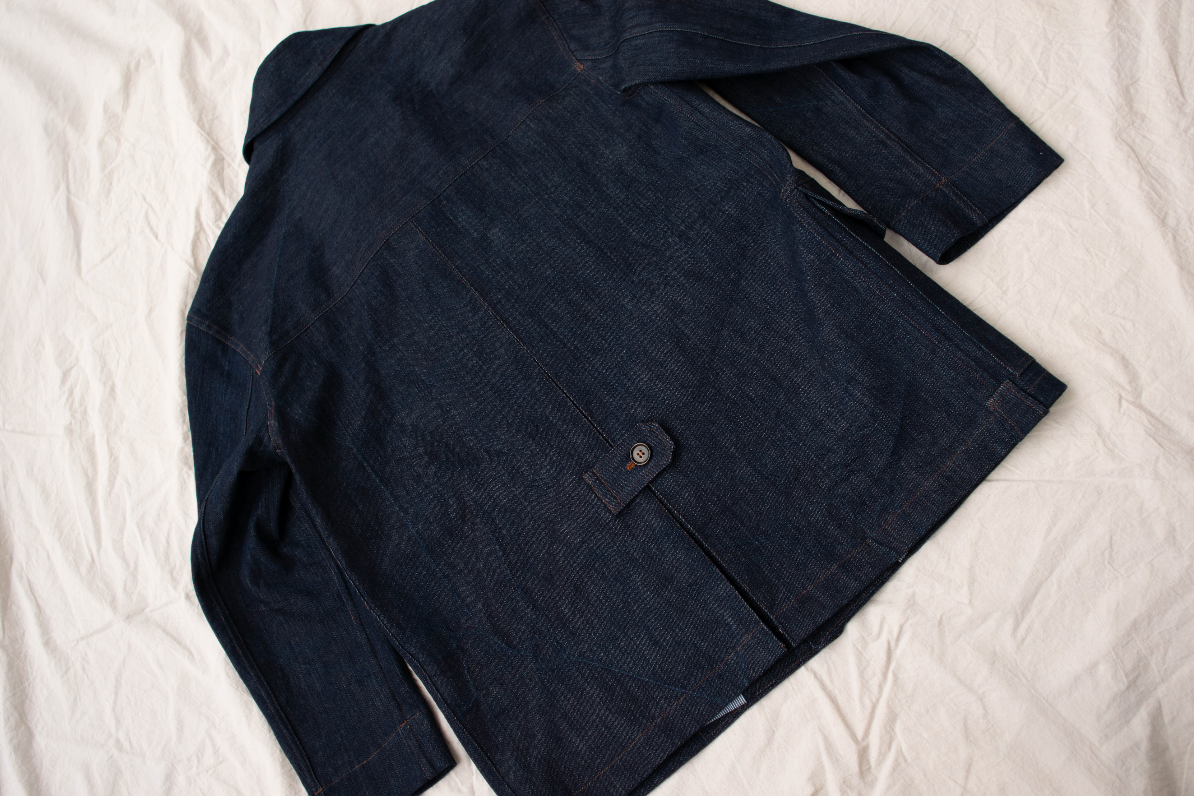 The prototype is made from locally sourced raw denim. Other ideal fabrics for it include cotton and linen canvas and twill, oilskin, dry oilskin and medium to heavy weight wool.