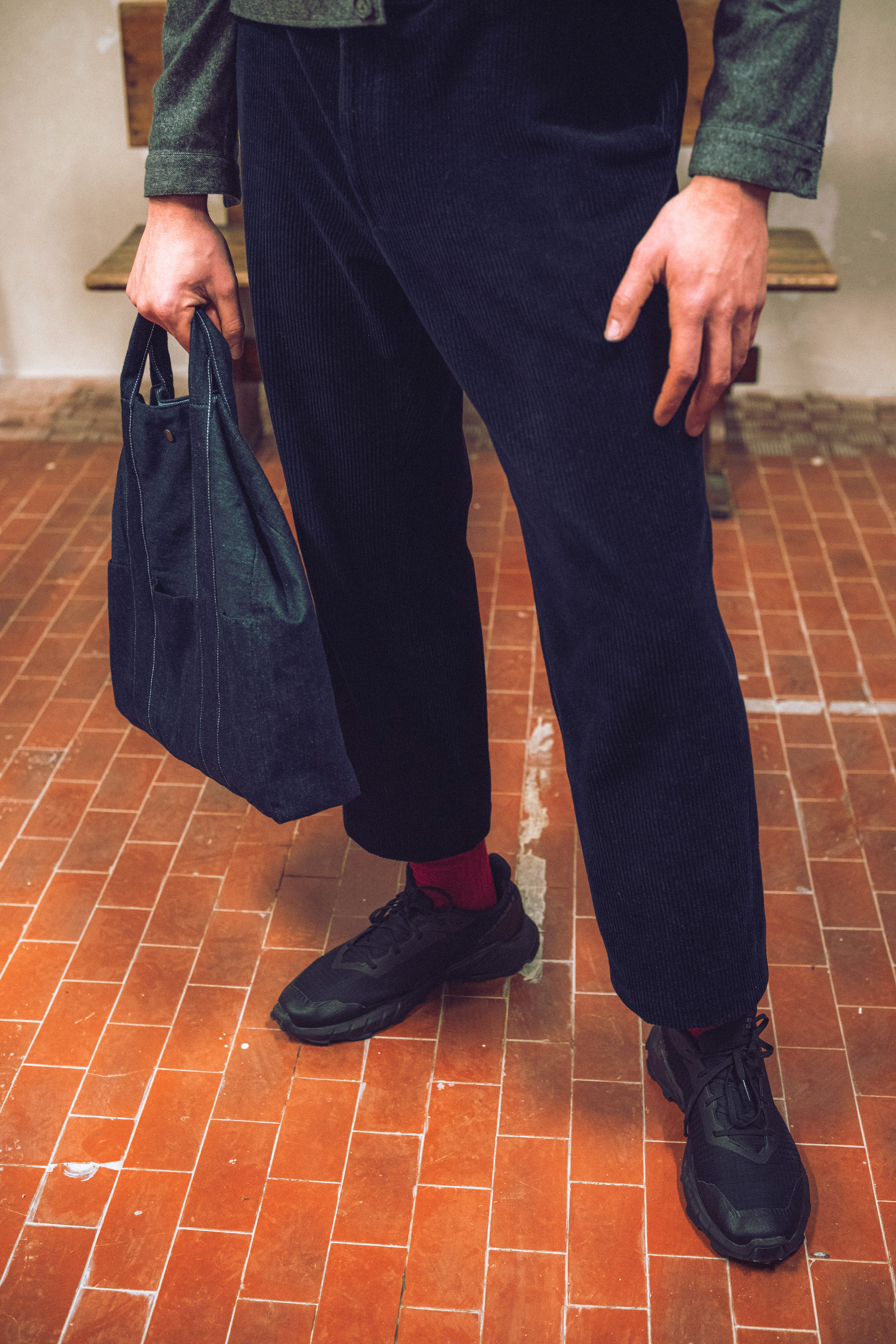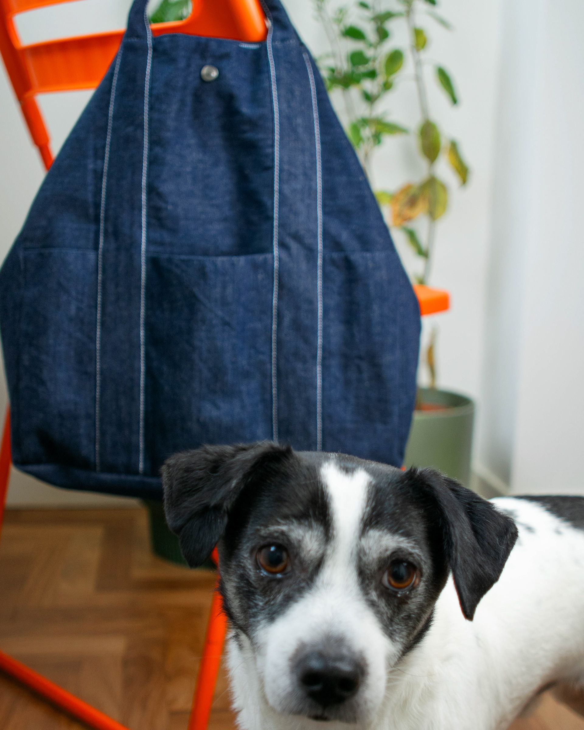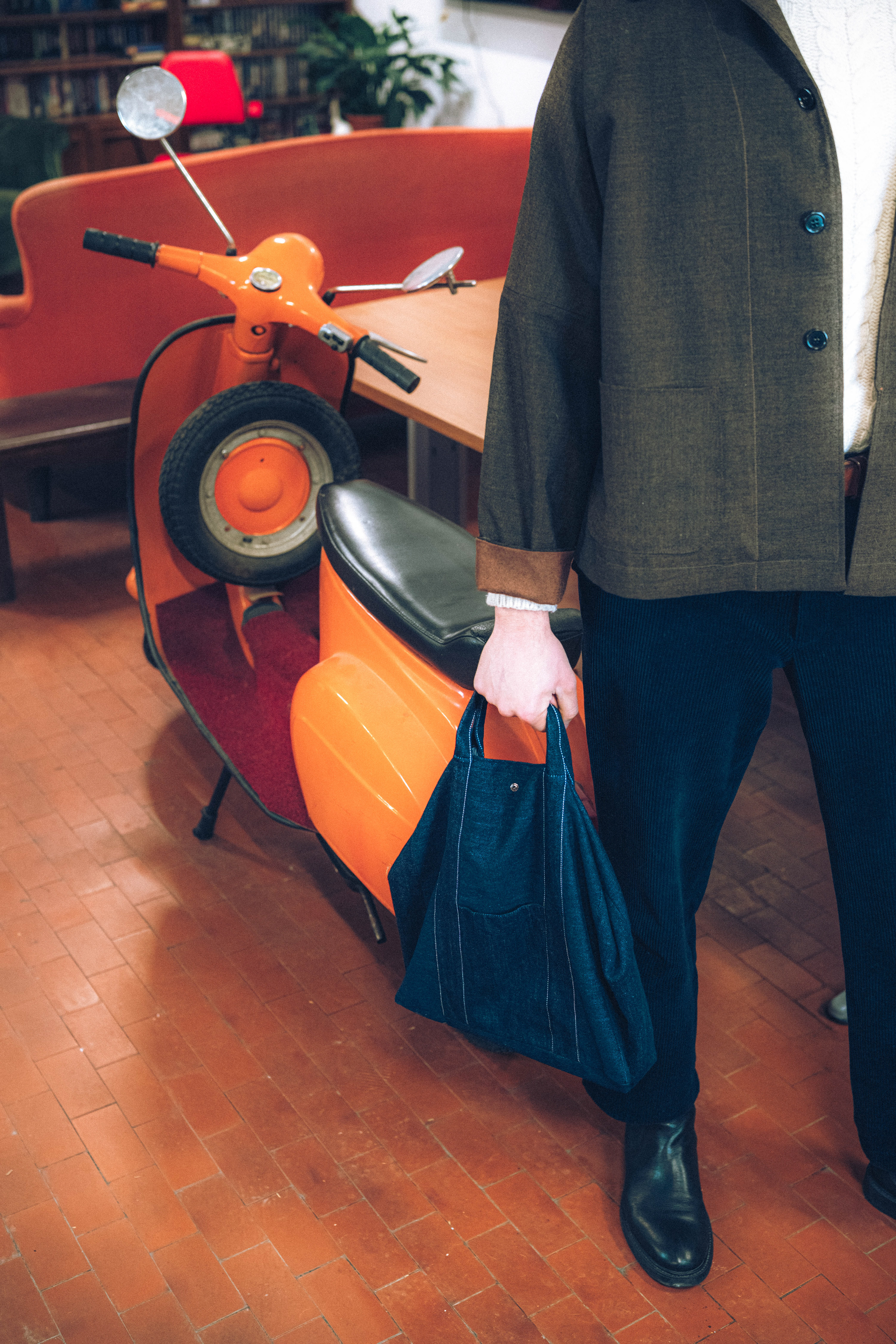 the everyday tote is made from 100% cotton raw denim. It features four external pockets, a cotton lining and a snap closure. It is designed to fit a 13'' laptop and to be sturdy and light enough to carry around all day.